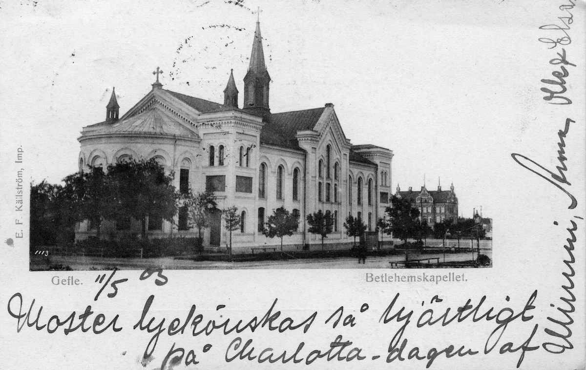 Gävle, "Betlehemskapellet". Ett brevkort Till Fru Lotten Bylund, Döbelnsgatan 29, 4 tr. Stockholm. Med texten "Moster lyckönskas så hjärtligt på Charlotta-dagen af Mimmi, Anna och Elsa, Gefle den 11 maj 1903".