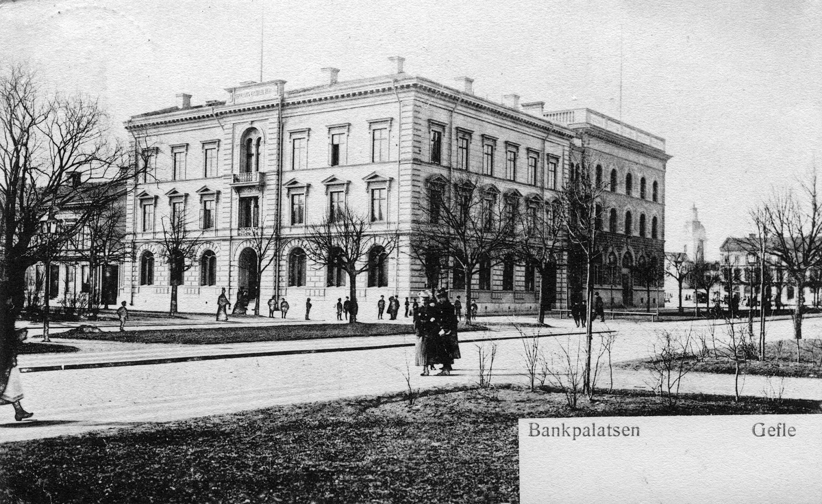 Gävle, "Bankpalatsen". Ett brevkort Till Fru Charlotta Bylund, Döbelnsgatan 29, 4 tr. Stockholm. Med texten "G. 19 11/5 19. Hjärtligaste lyckönskningar på högtidsdagen från tillgifna M - i!".