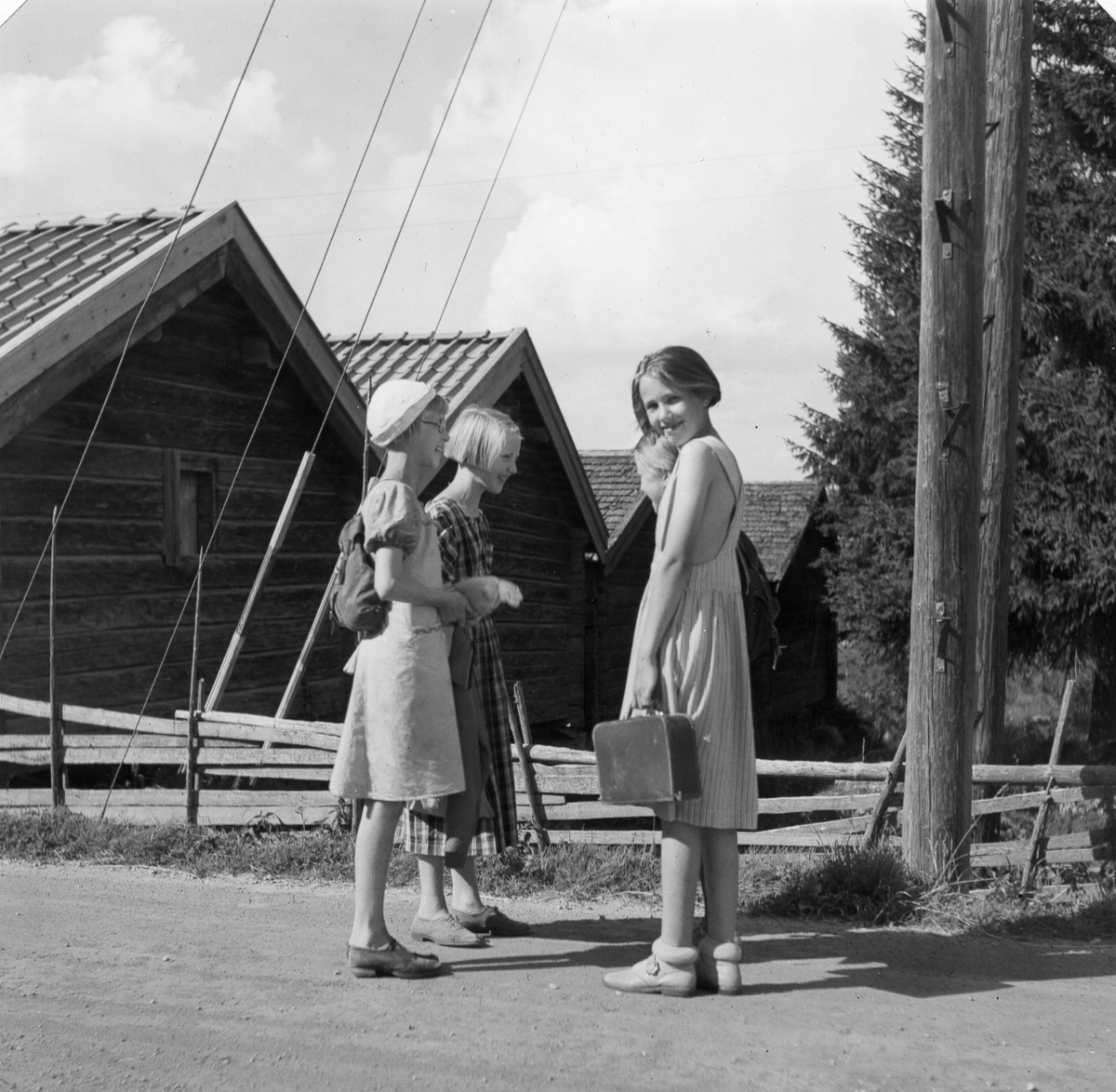Tre barn utanför träbyggnader.