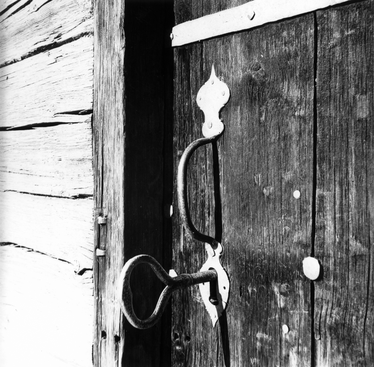 Lås med nyckel på träbyggnad. Eventuellet från Sanna, Hälsingland.
