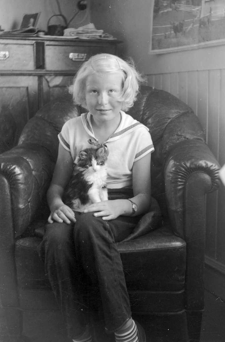 Flicka med kattunge i knä. (Bilden något suddig).