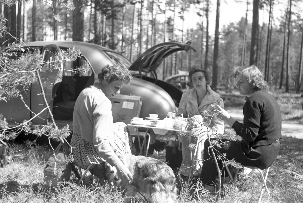 Till vänster Greta Olsson, i mitten Frideborg Jonsson och till höger Ingrid Stolt. I bakgrunden en Wolseley 4/44 från mitten 1950-talet.