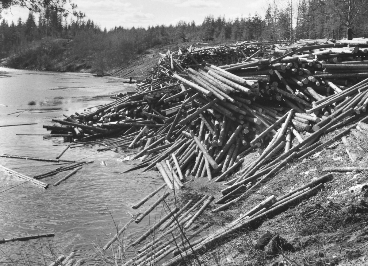Timmerupplag för vårflottning. Testeboån, Åmotsbruk.