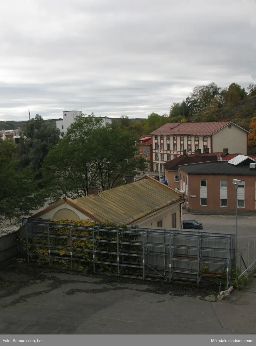 Vy mot Götiska Förbundets Friskola och mot bebyggelse vid Gamla torget från byggnad vid Soabs industrianläggning i Mölndals Kvarnby, år 2007. Anläggningen användes vid fototillfället av Hexion Speciality Chemicals Sweden AB.