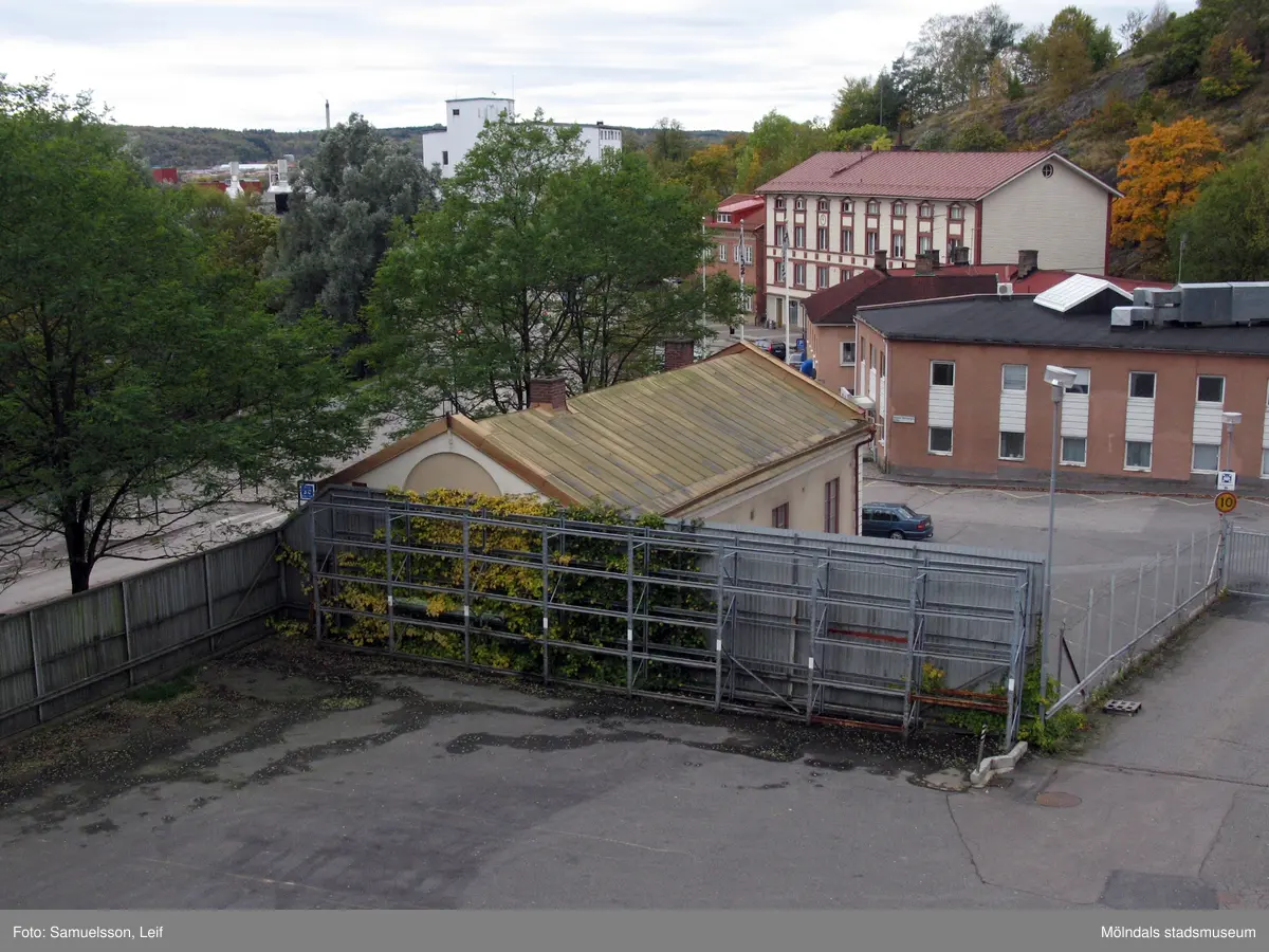 Vy mot Götiska Förbundets Friskola och mot bebyggelse vid Gamla torget från byggnad vid Soabs industrianläggning i Mölndals Kvarnby, år 2007. Anläggningen användes vid fototillfället av Hexion Speciality Chemicals Sweden AB.