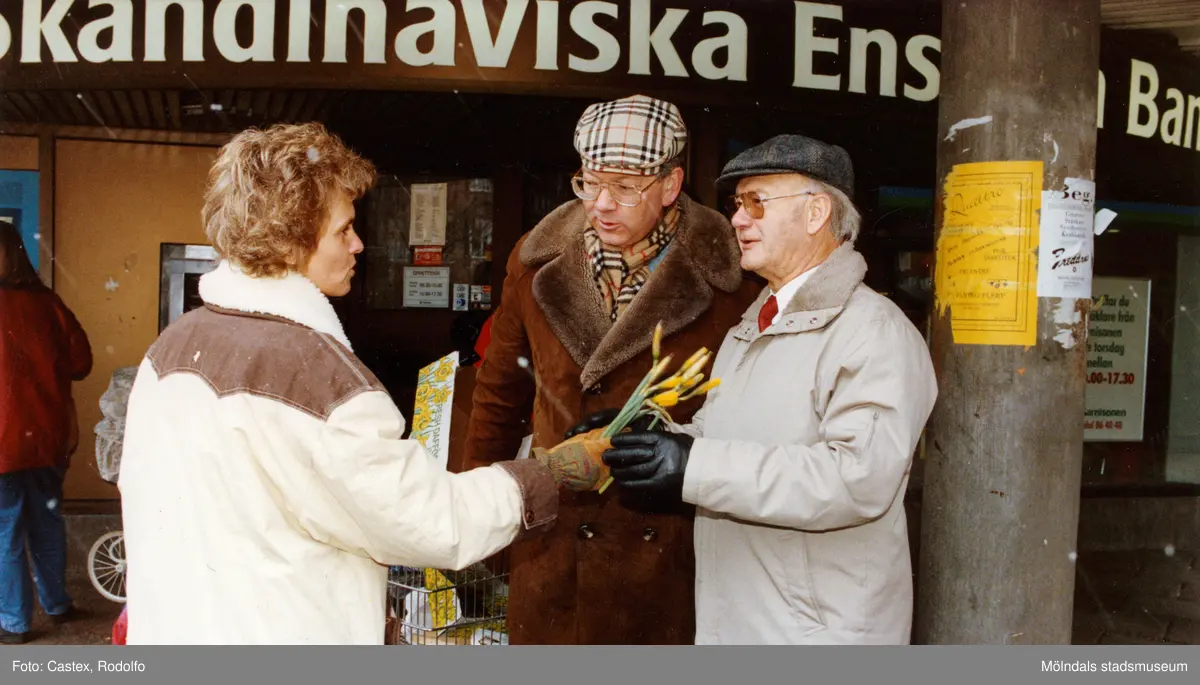 Medlemmar i fotbollsföreningen Jitex BK delar ut blommor till folk i Mölndals centrum i mars 1992. Två äldre herrar får blommor vid SEB på Brogatan.