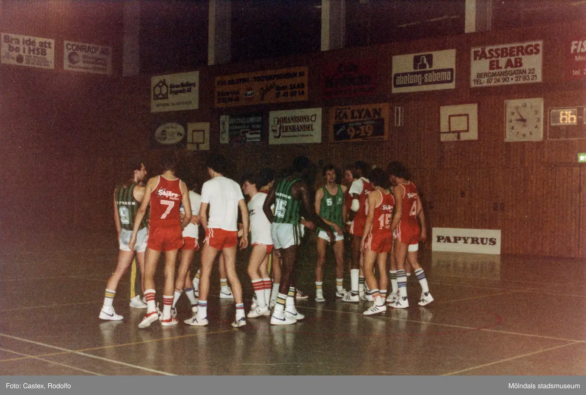 Kvarnby Baskets A-lag herrar spelar match i idrotthuset i Mölndal, mars 1984. Motståndarlag och slutresultat är okända.