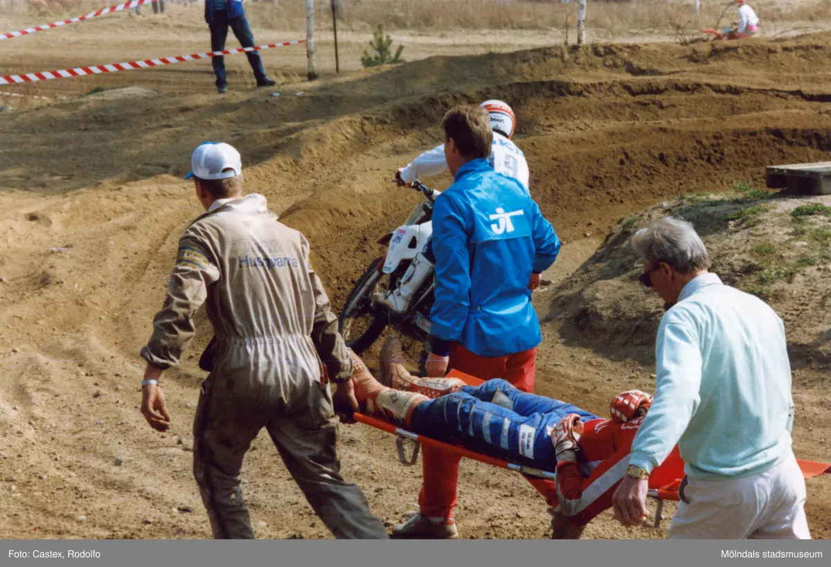Motocrosstävling på Blixåsbanan i Balltorp, Mölndal, den 1 maj 1988. En skadad förare bärs bort på bår.