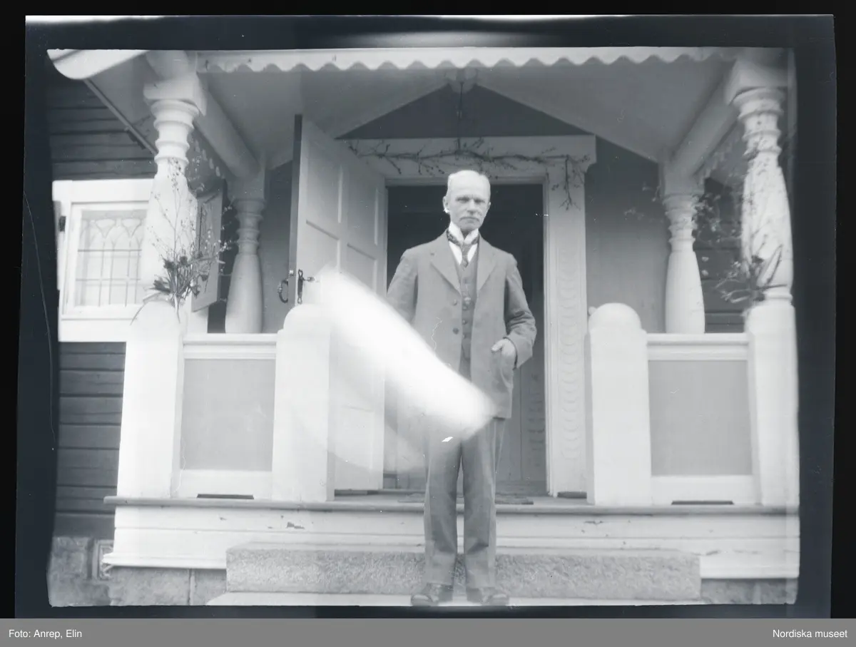 Porträtt av en man som står på trappan till ett hus. Farstukvisten är dekorerad med blommor och grenar.