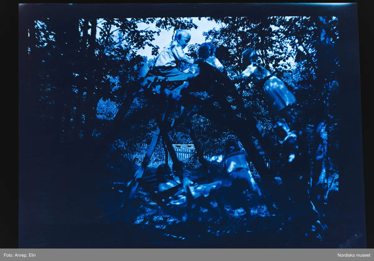 Barn leker i en hammock i trädgården till villa Solveden, Djursholm.