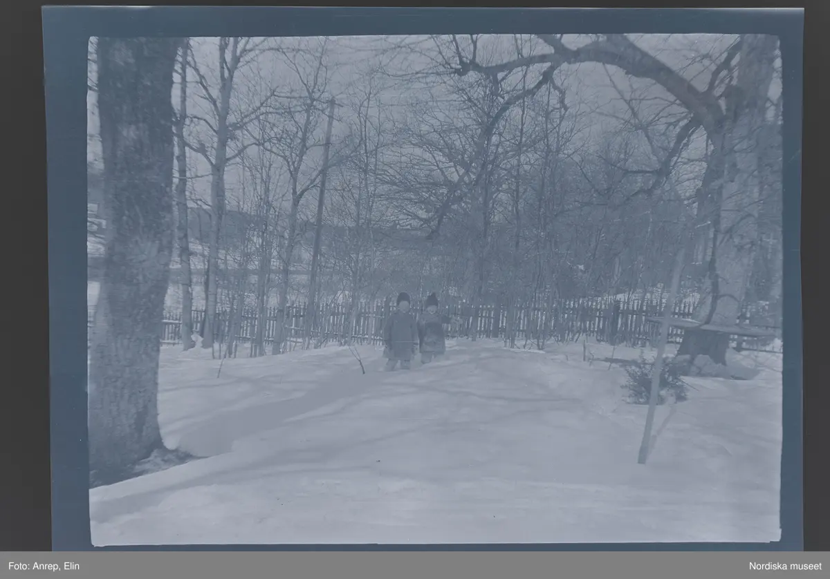 Två små barn i snön på tomten till familjen Morthensens villa Solveden, Djursholm.