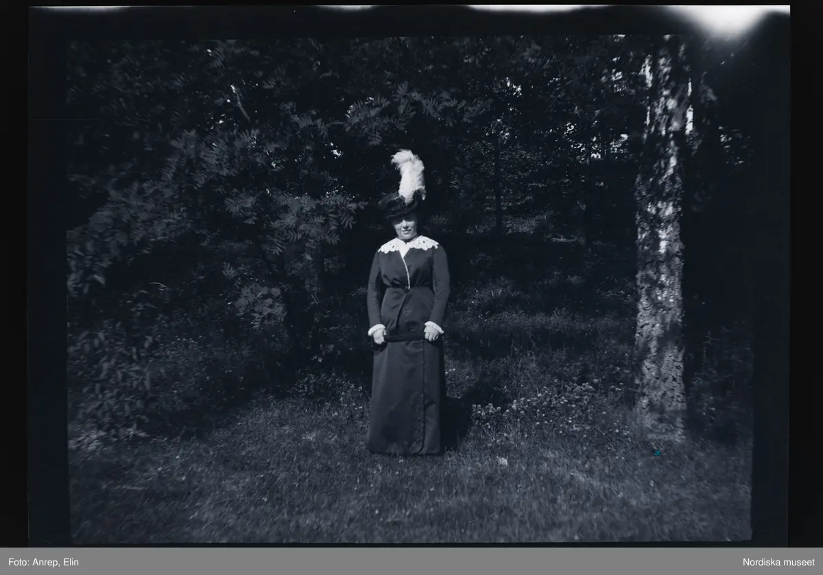 Elin Morthensen (född Anrep) porträtterad i hatt med fjäder, utomhus.