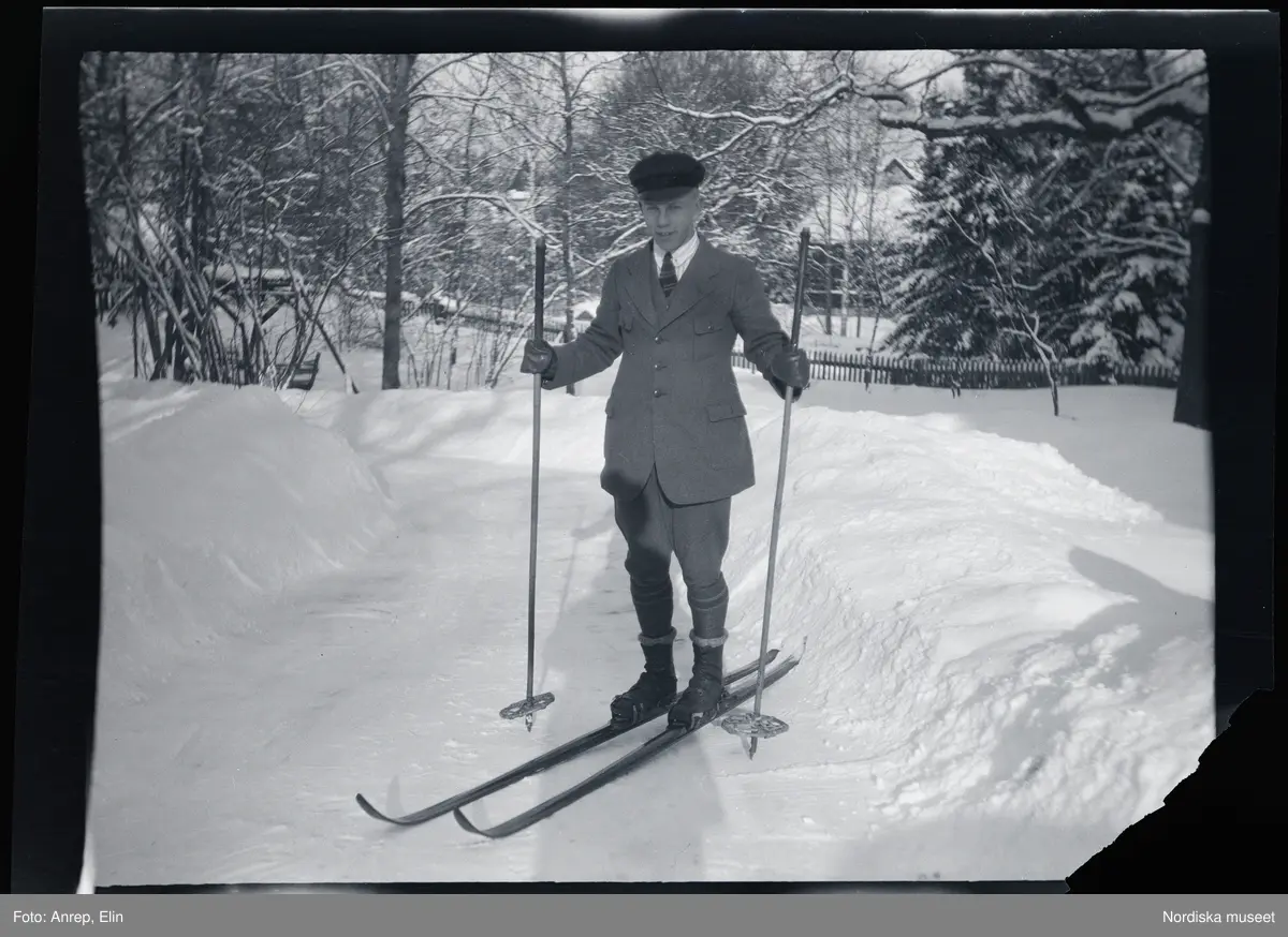 Ung man på skidor, på tomten till familjen Morthensens villa Solveden, Djursholm.