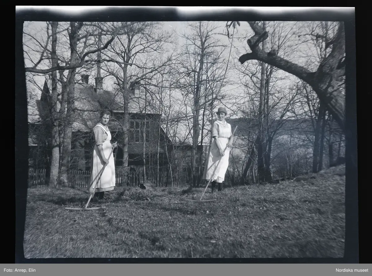 Två tjänstekvinnor krattar gräsmattan till Villa Solveden, Djursholm.