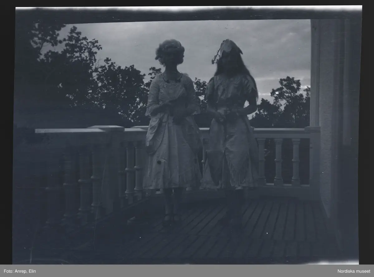 Två flickor, Gudrun och Elsa, utklädda. Porträtterade på balkongen till familjen Morthensens villa Solveden, Djursholm.