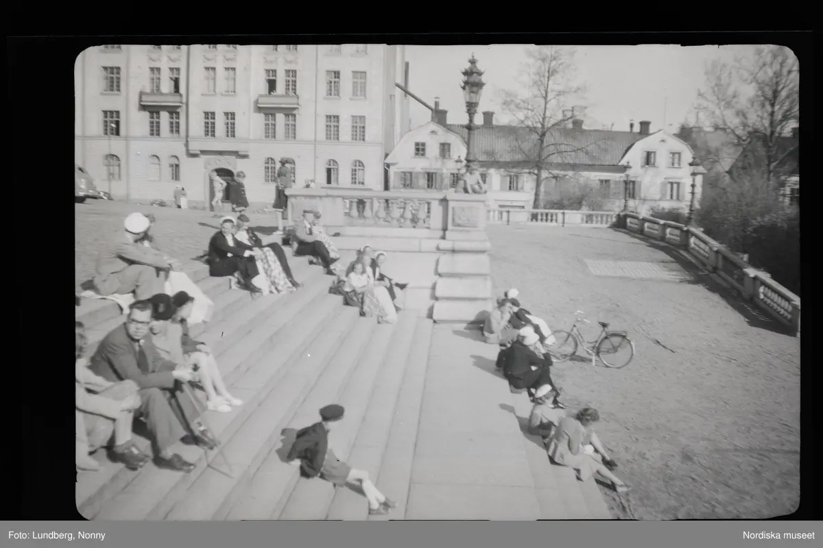 Människor sitter på trappen framför Universitetshuset i Uppsala.