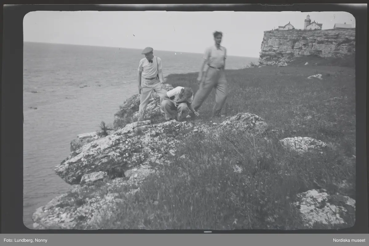 Ett par män och en kvinna ute på klippor. I bakgrunden Stora Karlsö fyr.