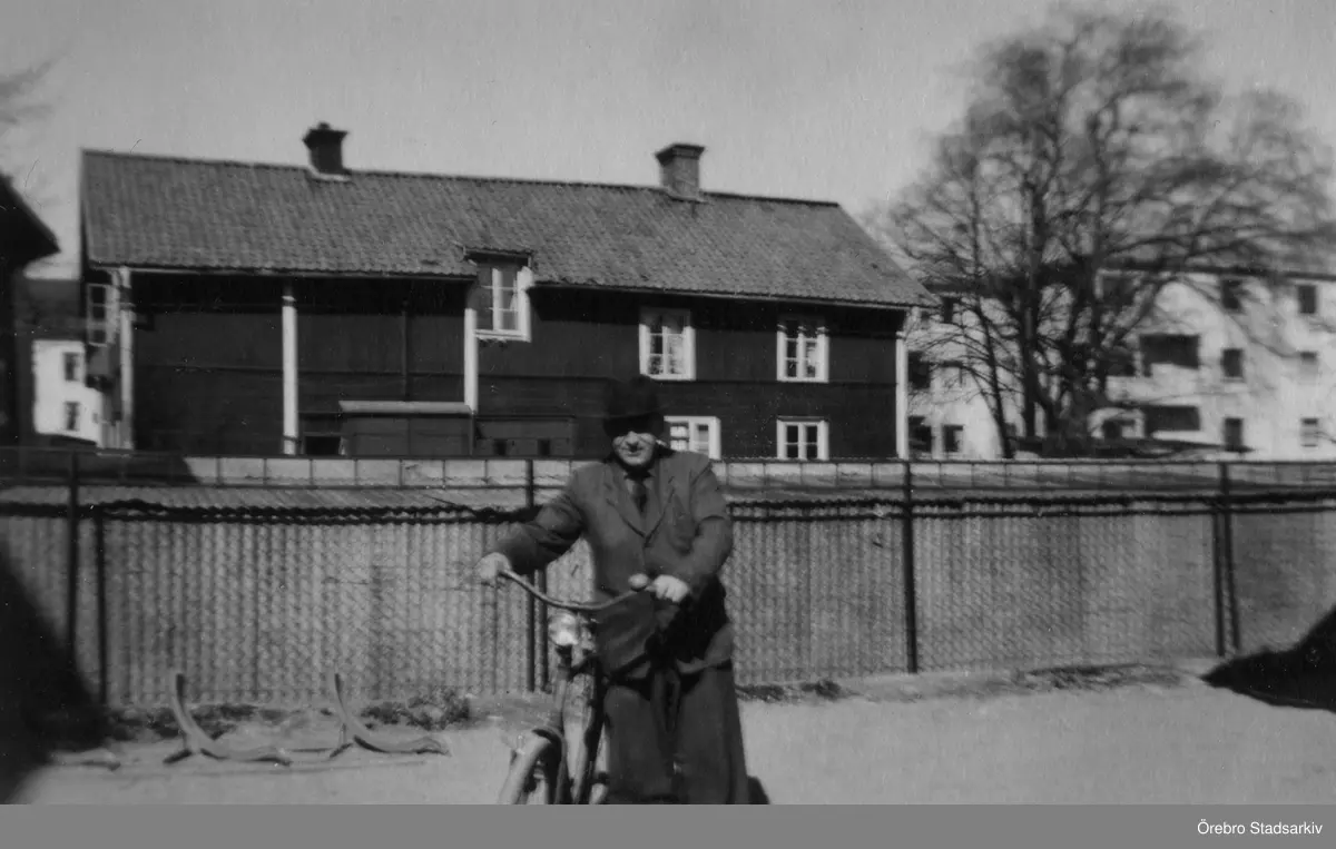 Man med cykel framför staket och hus