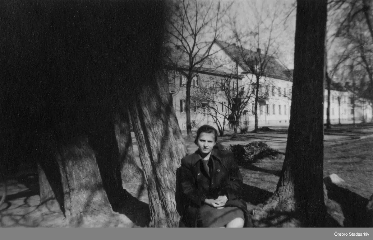 Kvinna sitter vid ett träd framför ett hyreshus