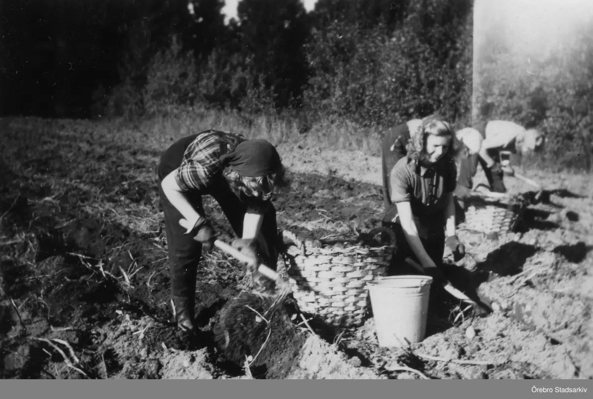 Fyra flickor plockar potatis i Almby