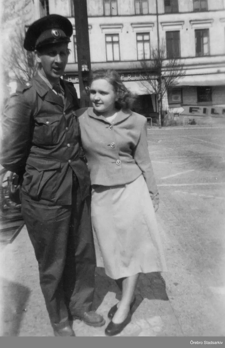 Man med chaufförsuniform och kvinna på Våghustorget i Örebro