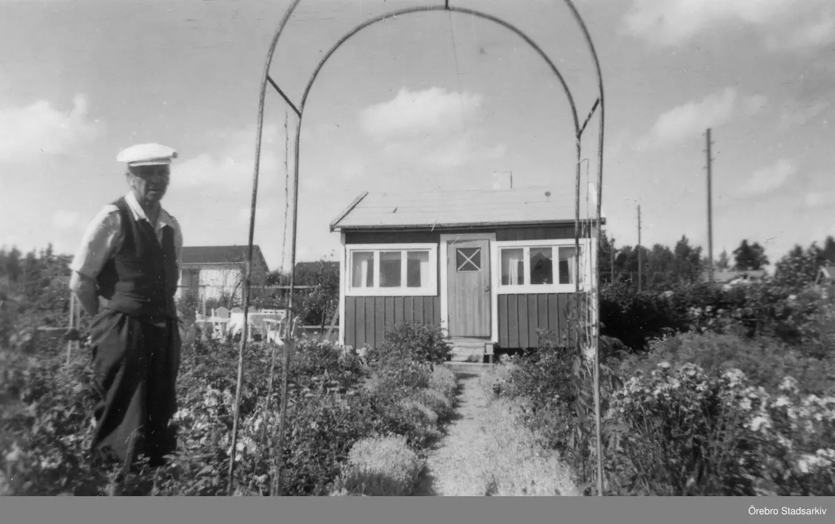 Man framför kolonistuga i Ormesta sommaren 1951