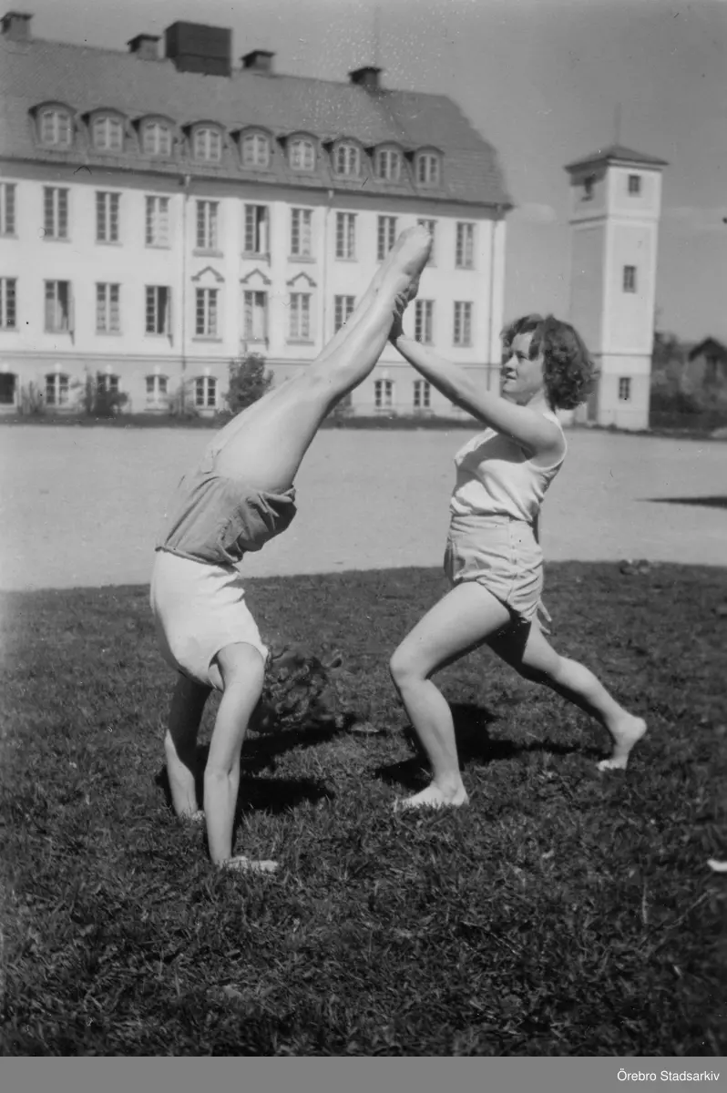 Två skolungdomar gymnastiserar framför Almby skola, 1945