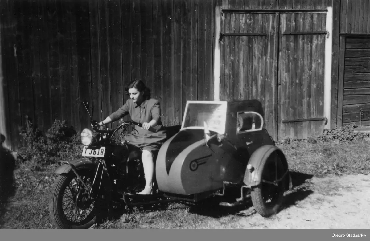 Kvinna på sidovagnsmotorcykel i Hallsberg, 1951