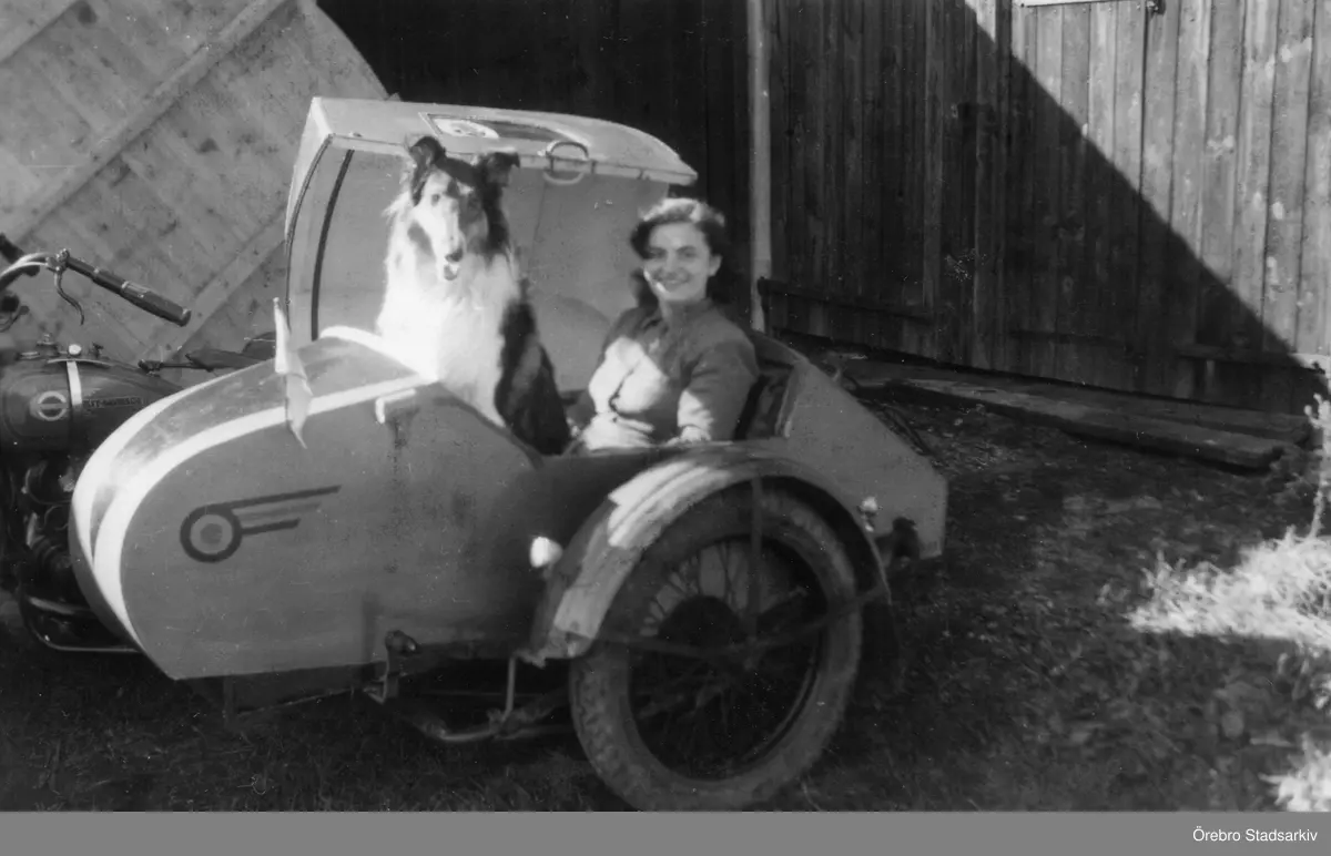 Kvinna med hund i en sidovagnsmotorcykel i Hallsberg, 1951