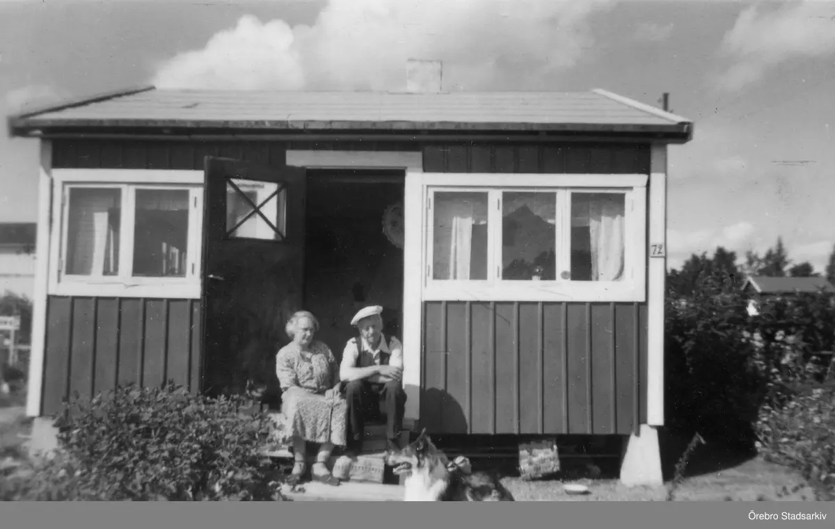 Kvinna och man med hund framför kolonistuga i Ormesta sommaren 1951