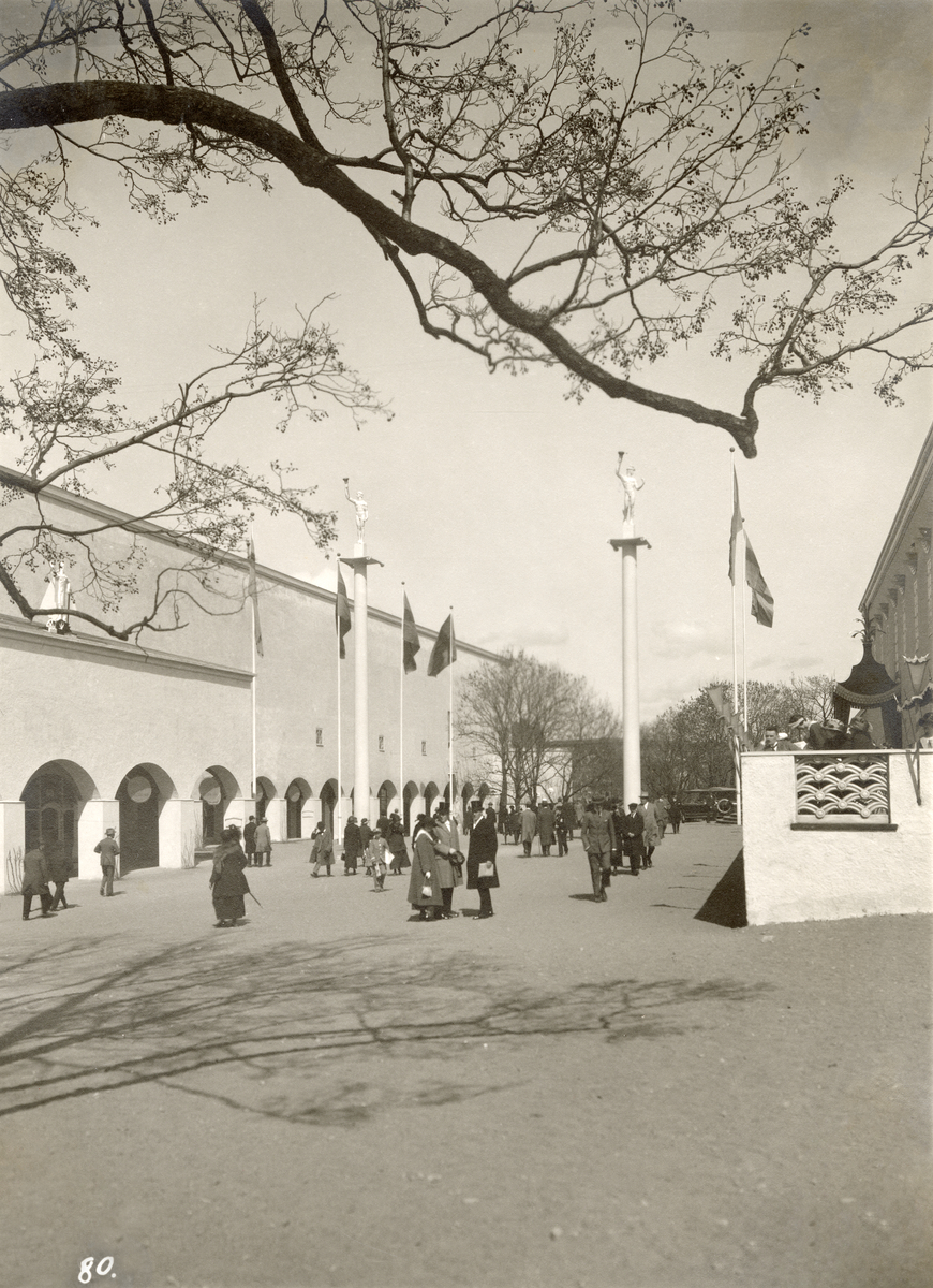 Den historiska industriutställningen till vänster i bild och Huvudrestauranten till höger i bild