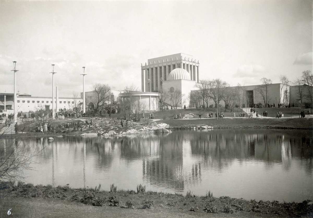 Näckrosdammen med Huvudrestauranten, Minneshallen och handelshistoriska utställningens kupolförsedda byggnad