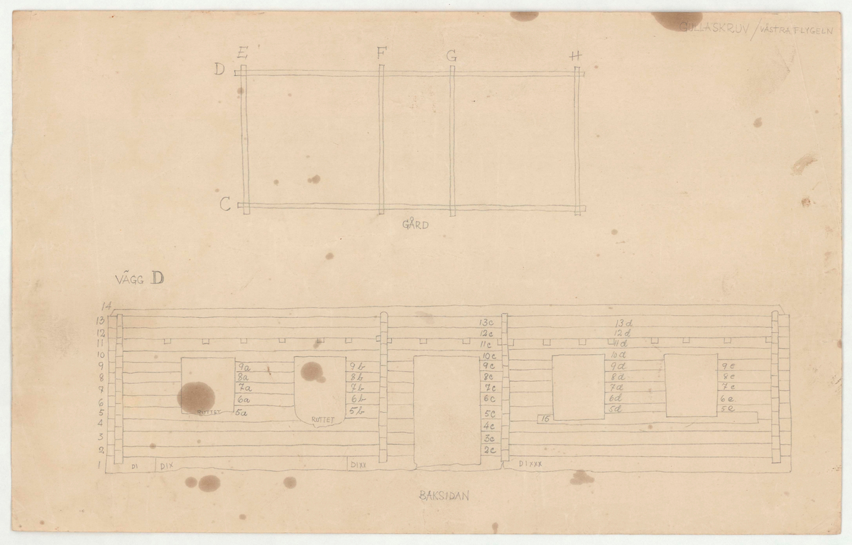 Titel: Skogaholms herrgård. Biblioteksflygeln. Detaljritning. GULLASKRUV/VÄSTRA FLYGELN. VÄGG D.