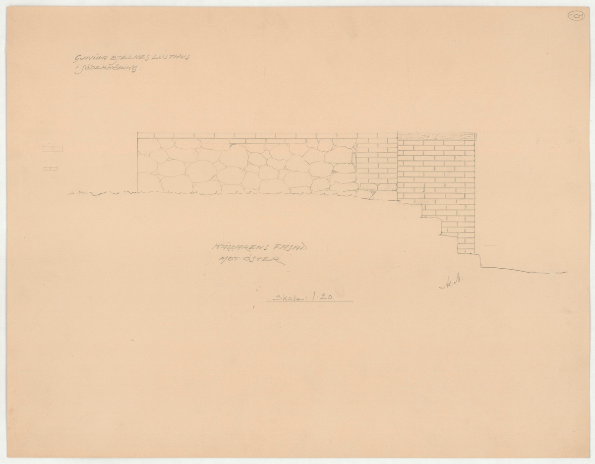 Titel: Skogaholms herrgård. Gunilla Bielkes lusthus. Västra paviljongen. Fasadritning. Källarens fasad mot öster. Skala 1:20.