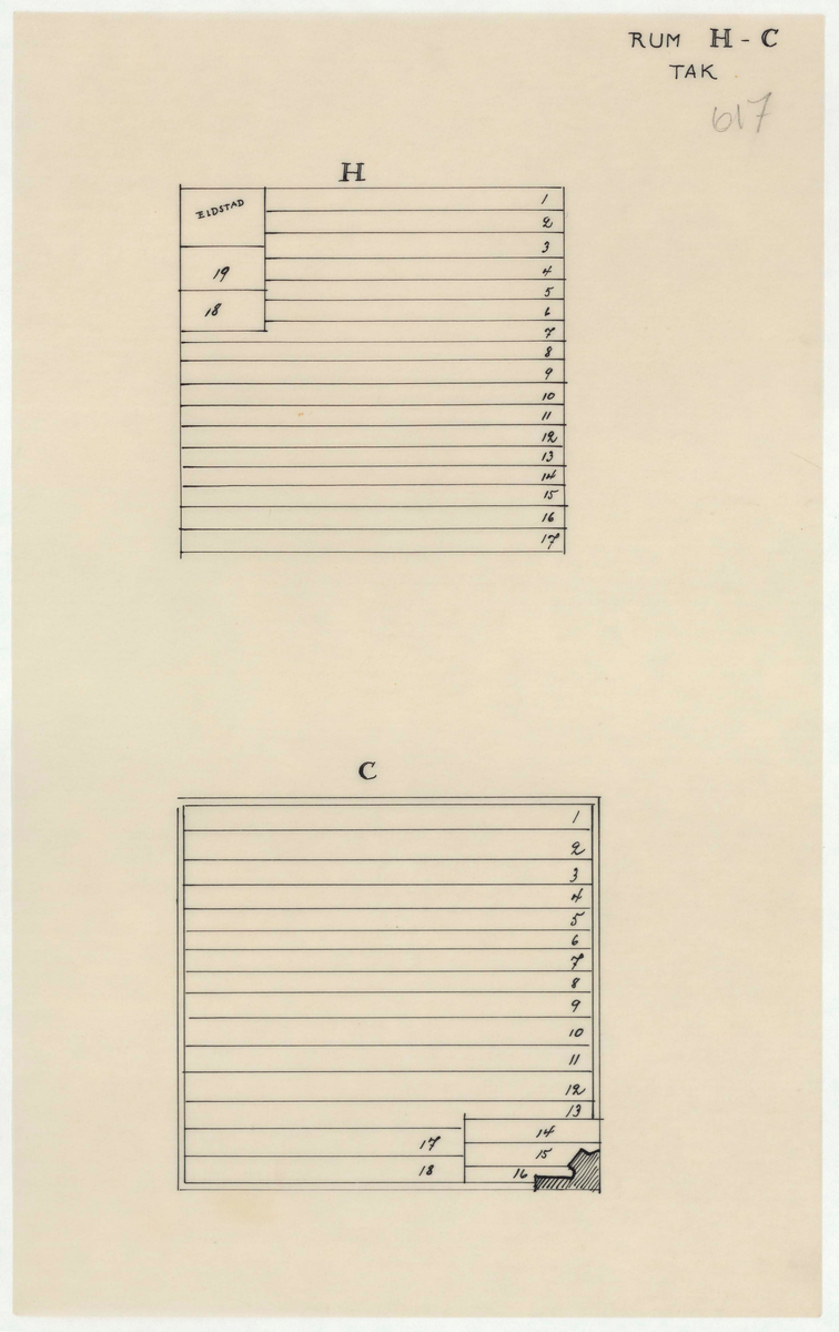 Titel: Skogaholms herrgård. Huvudbyggnaden. Detaljritning. RUM H-C. TAK.
