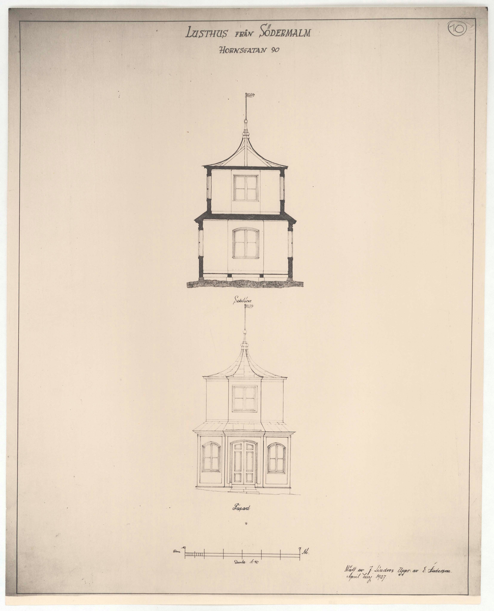Titel: Spannmålshandlarens lusthus. Sektionsritning. Fasadritning. Lusthus från Södermalm Hornsgatan 90
