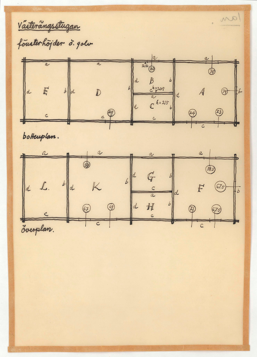 Titel: Delsbogården. Planritning. Västerängsstugan. Bottenplan. Överplan.