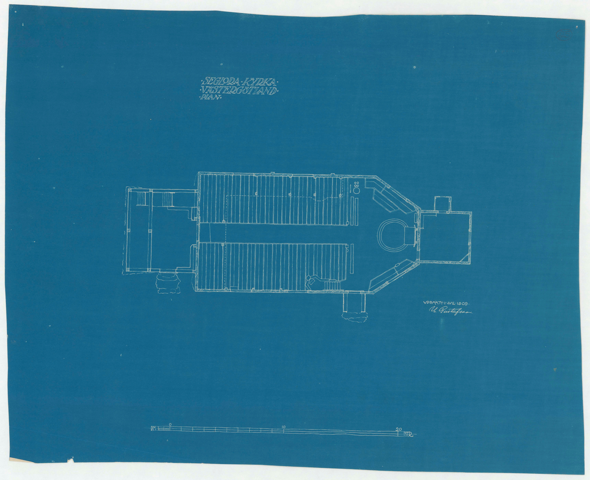 Titel: Seglora kyrka. Ursprungsplatsen i Västergötland. Planritning. Blåkopia.