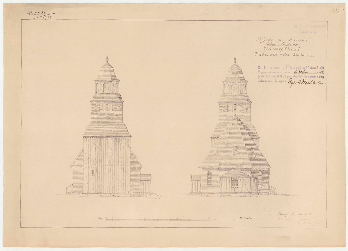 Titel: Seglora kyrka. Fasadritning. Fasad mot väster och fasad mot öster.