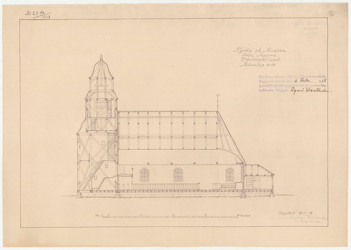 Titel: Seglora kyrka. Genomskärning. Långsida.