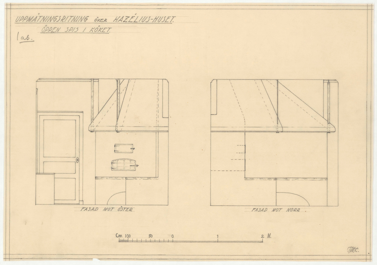 Titel: Hazeliushuset. Uppmätningsritning. Öppen spis i köket.