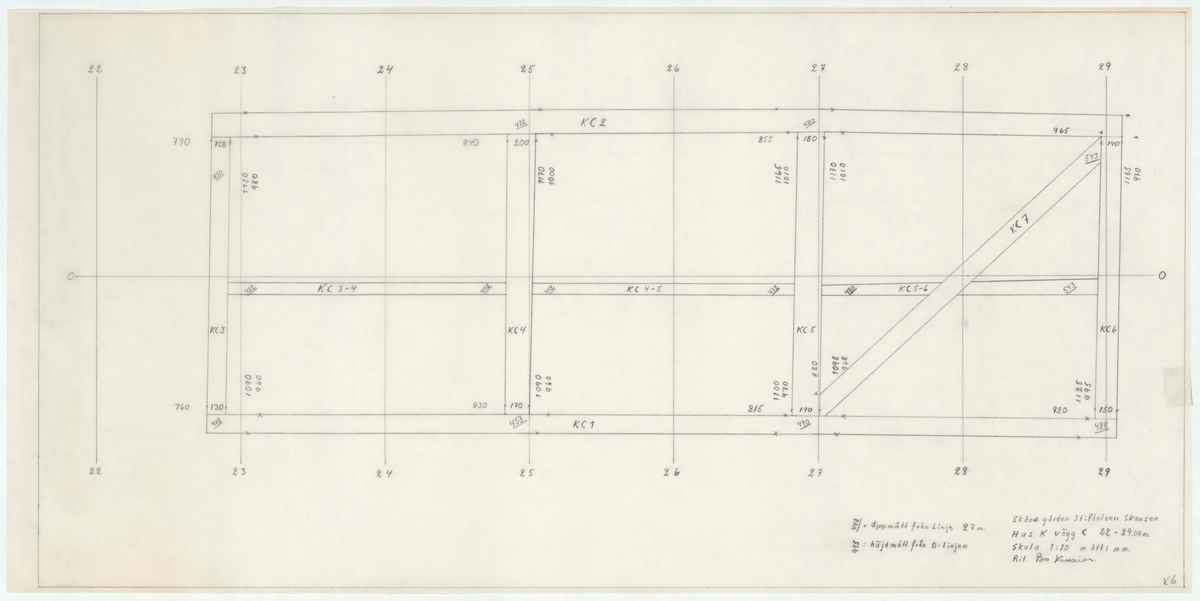 Titel: Skånegården. Västra loglängan. Detaljritning. Hus K. Vägg C. Skala 1:10