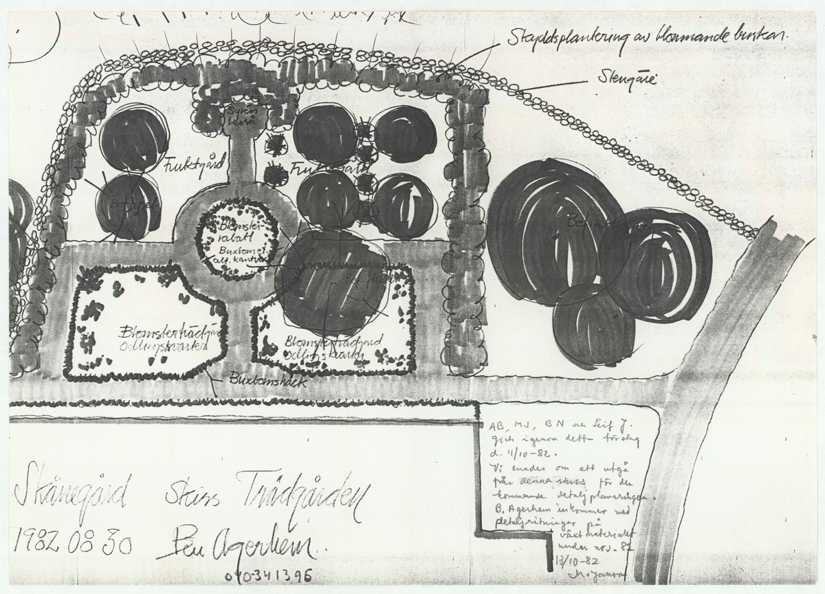 AB [Arne Biörnstad], MJ [Mats Jansson], BN och Leif Johansson gick igenom detta förslag 11/10-82. Vi enades om att utgå från denna skiss för den kommande detaljplaneringen. B. Agerhem inkommer med detaljritning på växtmaterial under nov. 1982. 13/10-82 / M. [Mats] Jansson.
