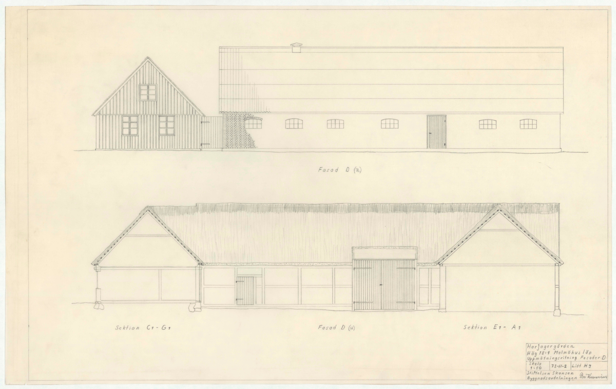 På Fasad D in mot gårdsplanen även Sektion C1-G1 och Sektion E1-A1.