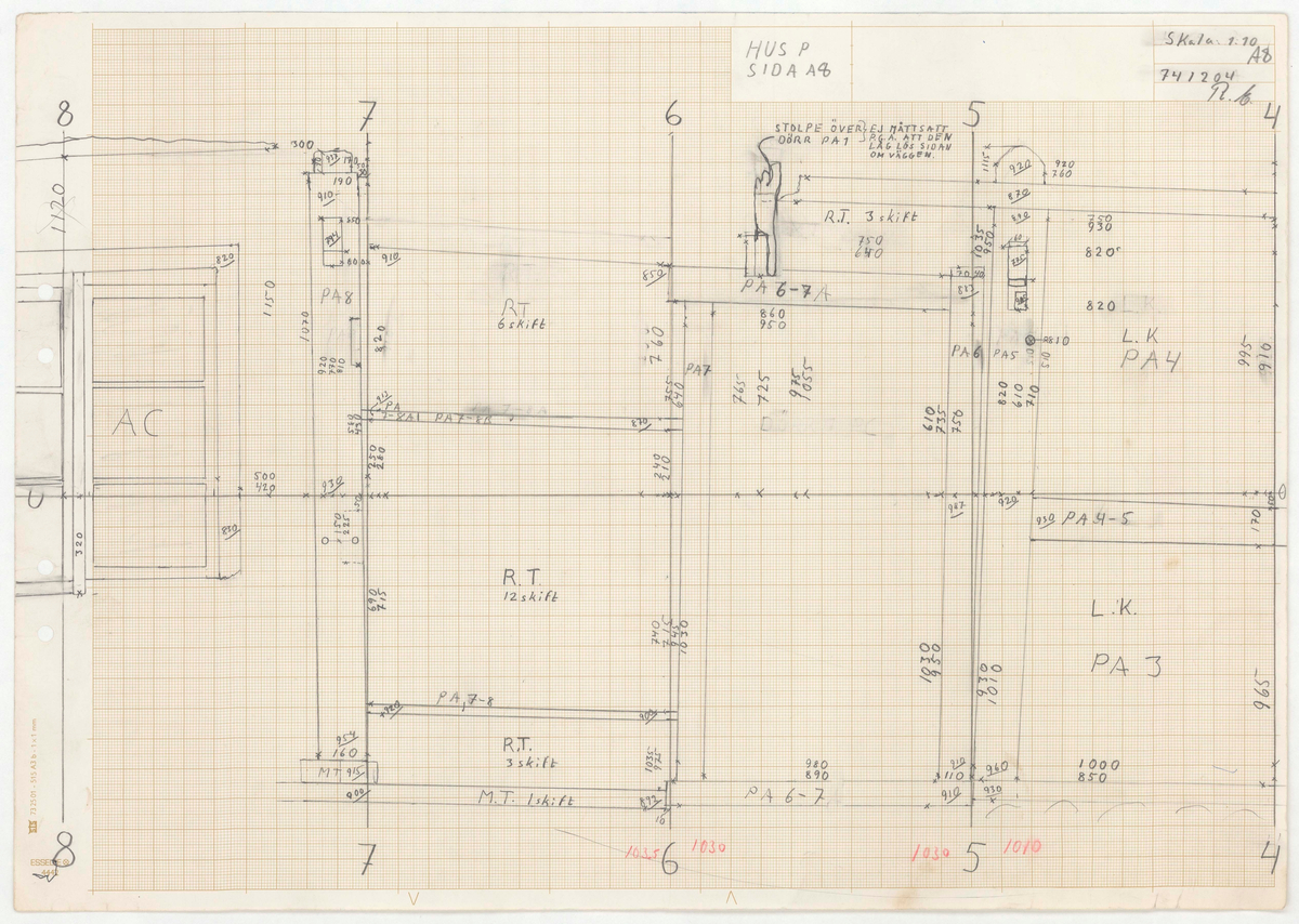 Titel: Skånegården. Bostadshuset. Detaljritning. HUS P. SIDA A8. Skala 1:10