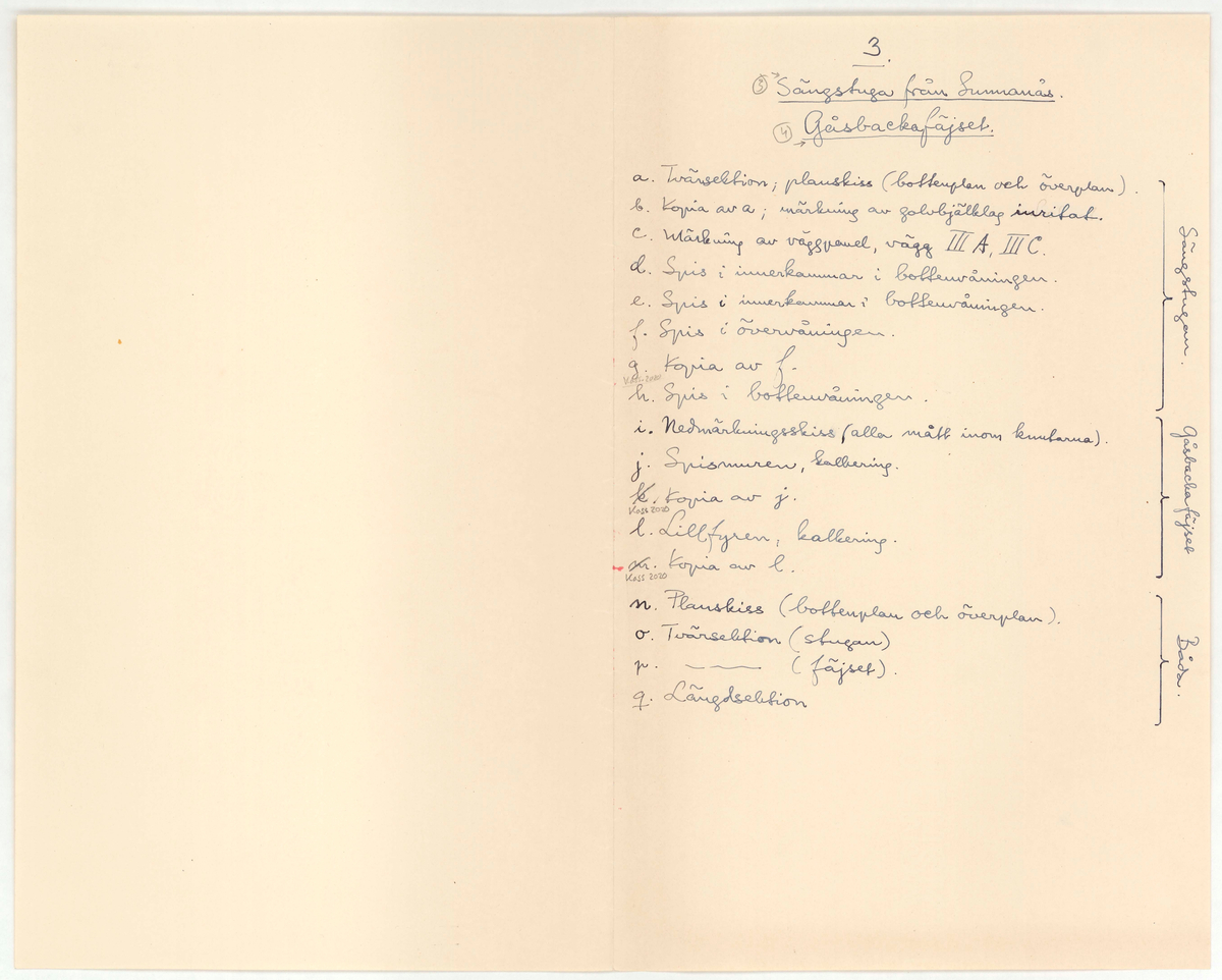 Titel: Delsbogården. Lista. Kompletterande information till ritningar. Gåsbackafjäset och Sunnanåssängstugan.