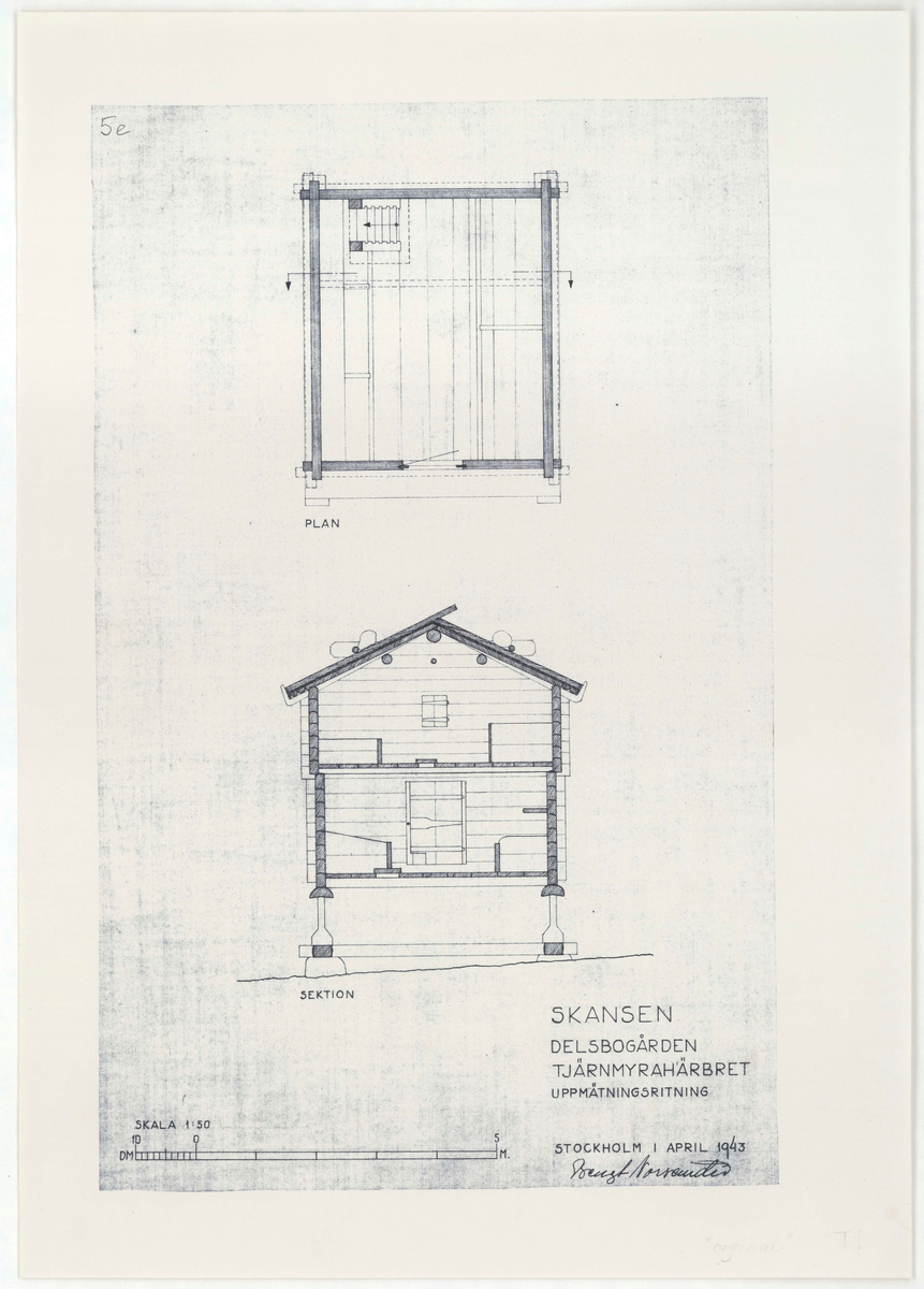 Titel: Delsbogården. Uppmätningsritning. Planritning. Sektionsritning. Tjärnmyrahärbret.