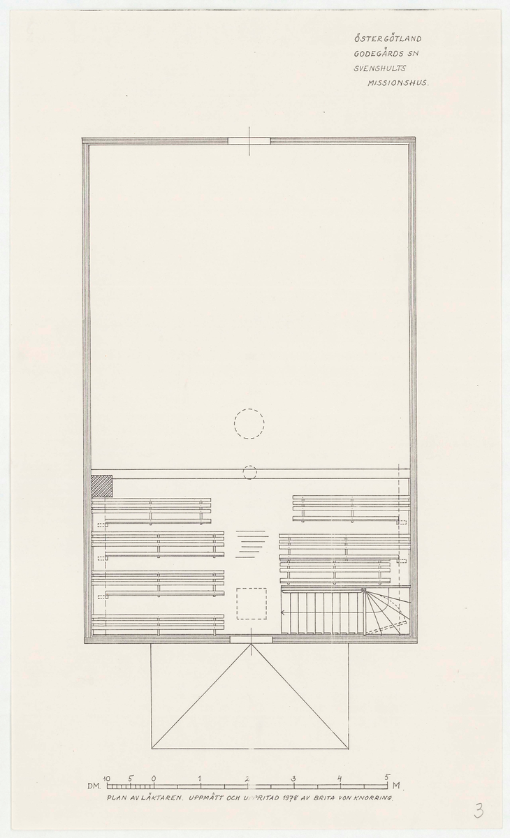 Titel: Missionshuset. Planritning. Läktaren. PLAN AV LÄKTAREN. UPPMÄTT OCH UPPRITAT 1978 AV BRITA VON KNORRING, NORDISKA MUSEET.