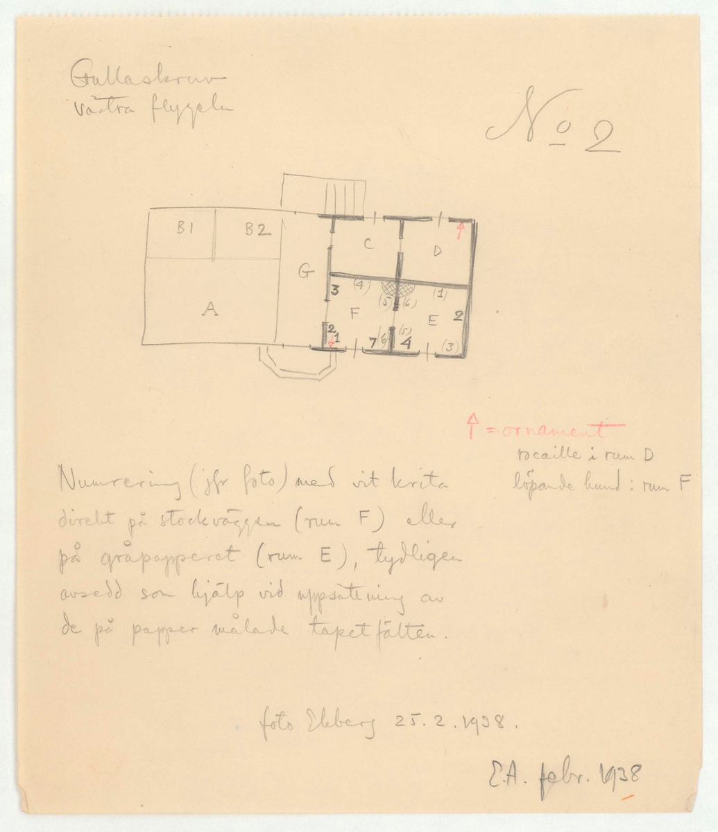 Titel: Skogaholms herrgård. Biblioteksflygeln. Planritning/skiss/anteckningar.