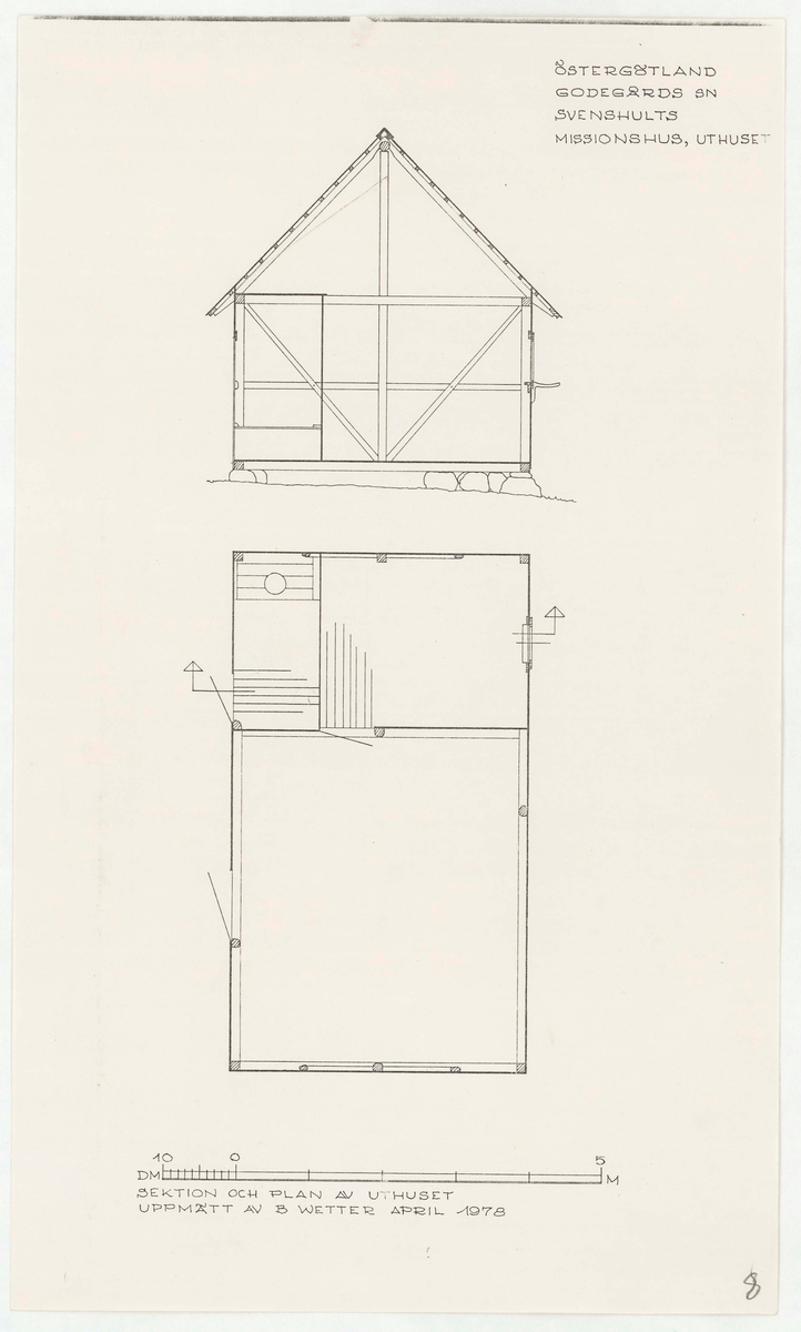Titel: Missionhuset. Uthuset Sektionsritning Planritning Uppmätt av B. Wetter april 1978.